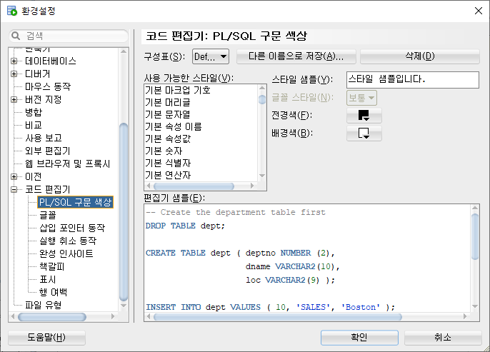 도구 -> 환경설정 -> 코드 편집기 -> PL/SQL 구문 색상