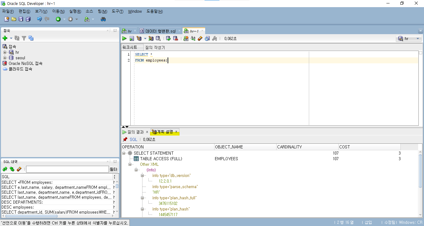 실행 플랜(Plan)을 확인 할 수 있는 '계획 설명창'을 보여준다: F10