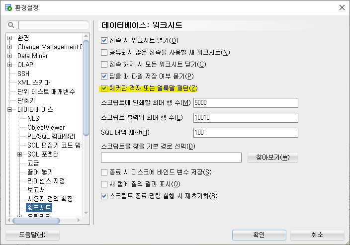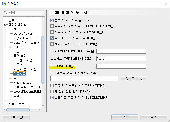 도구 -> 환경설정 -> 데이터베이스 -> 워크시트 -> SQL 내역 제한: 행 수 지정