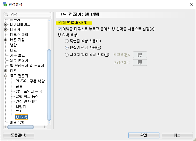 도구 -> 환경설정 -> 코드 편집기 -> 행 여백 -> 행 번호 표시: 체크