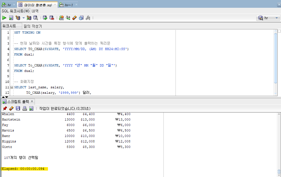 위에처럼 쿼리문 작성 시 'SET TIMING ON'을 위에 작성후 스크립트 출력을 하게 되면, 아래에 수행(실행)시간이 얼마나 걸리는지 확인 할 수 있다.