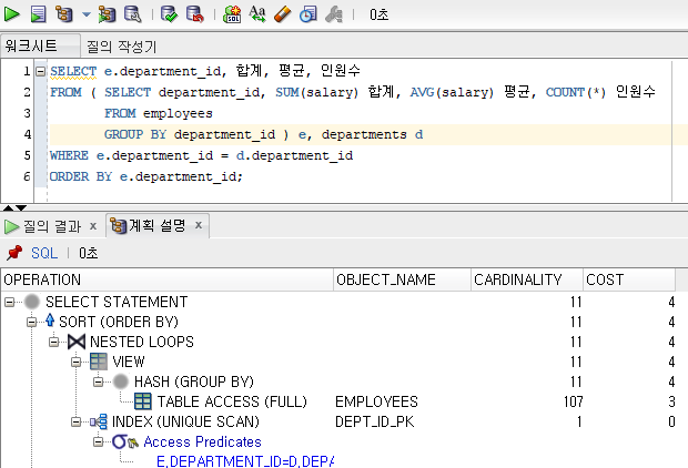 FROM ( SELECT department_id, SUM(salary) 합계, AVG(salary) 평균, COUNT(*) 인원수