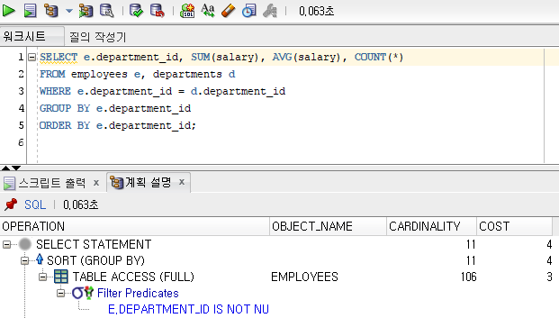 두 방식 모두 같은 결과를 출력하지만, 실행 계획을 확인하면 오라클 옵티마이저가 다른 실행 계획을 세우는것을 알 수 있다.
