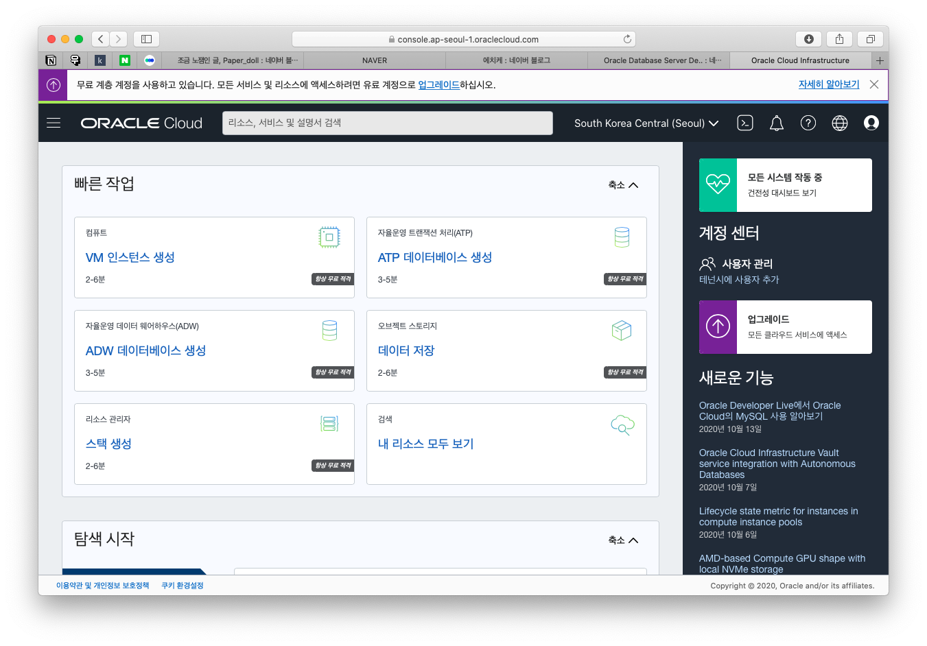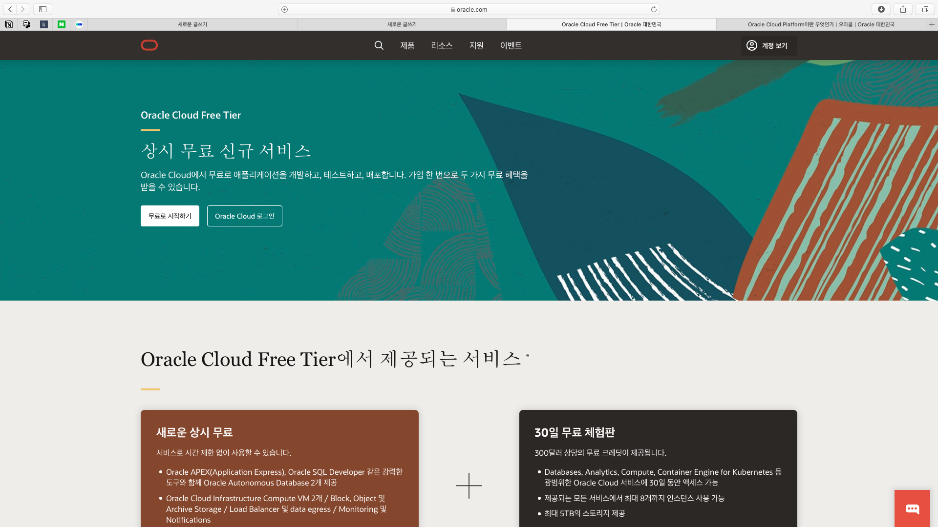 오라클 통합 로그인이 아닌 오라클 클라우드 접속을 위한 아이디를 생성해야하는데 회원가입이 굉장히 까다롭다. 회원 가입 도중 신용카드를 등록해야하는데, 이때 가장 중요한건 신용카드사에 저장한 주소와 내가 회원가입시 적은 주소가 동일해야한다. 신용카드사에 전화를 걸어 외국 사이트 회원 가입을 위해 영문주소 확인 및 추가를 추천한다.